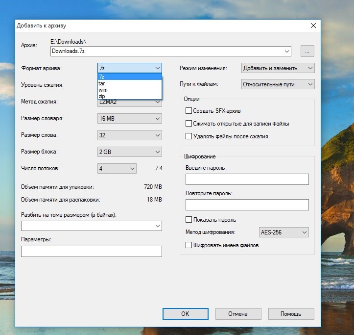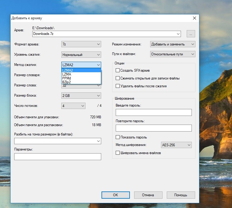Выберите метод сжатия. Обычно используется LZMA или LZMA2. Далее задайте остальные параметры архивации и нажмите ОК. Продолжительность операции зависит от объема данных.