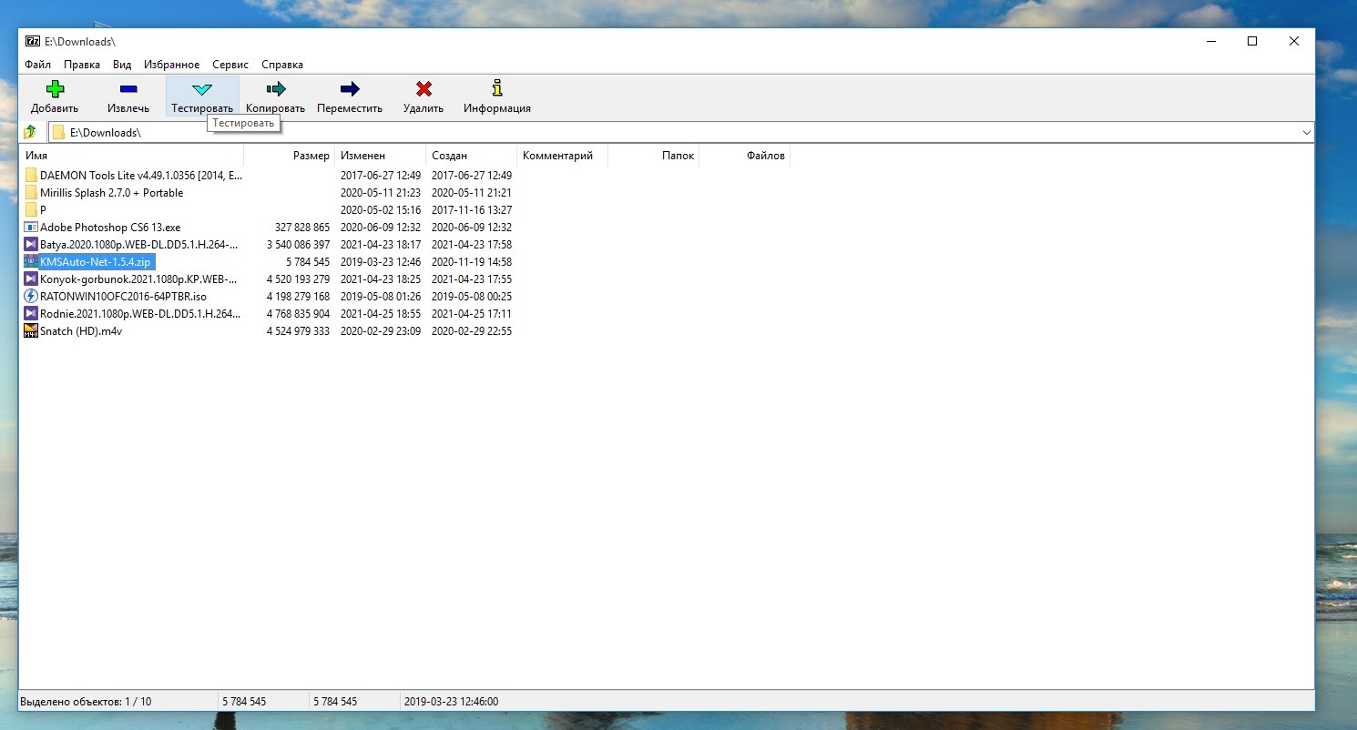 Очень полезная функция — тестирование архива) Сразу можно понять — возникнут проблемы при распаковке или все ок.