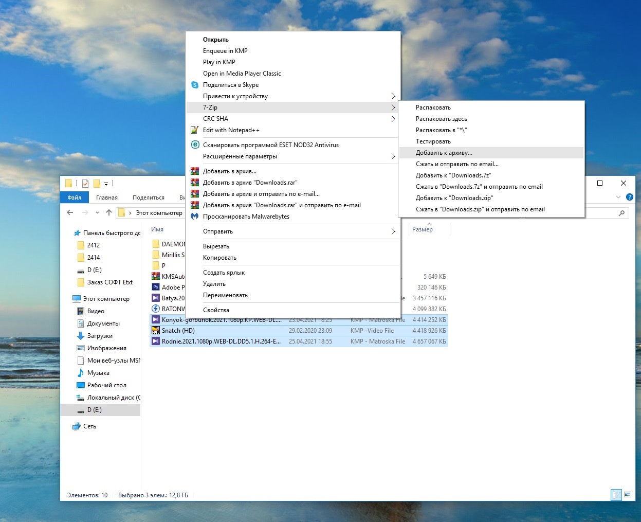 Выберите файлы в папке и выделите, а затем вызовите контекстное меню. Наведите курсор на 7zip и выберите Добавить в архив.